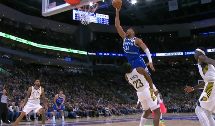 视觉效果炸裂!字母哥丝滑转身单臂隔扣内史密斯 可惜吹进攻犯规
