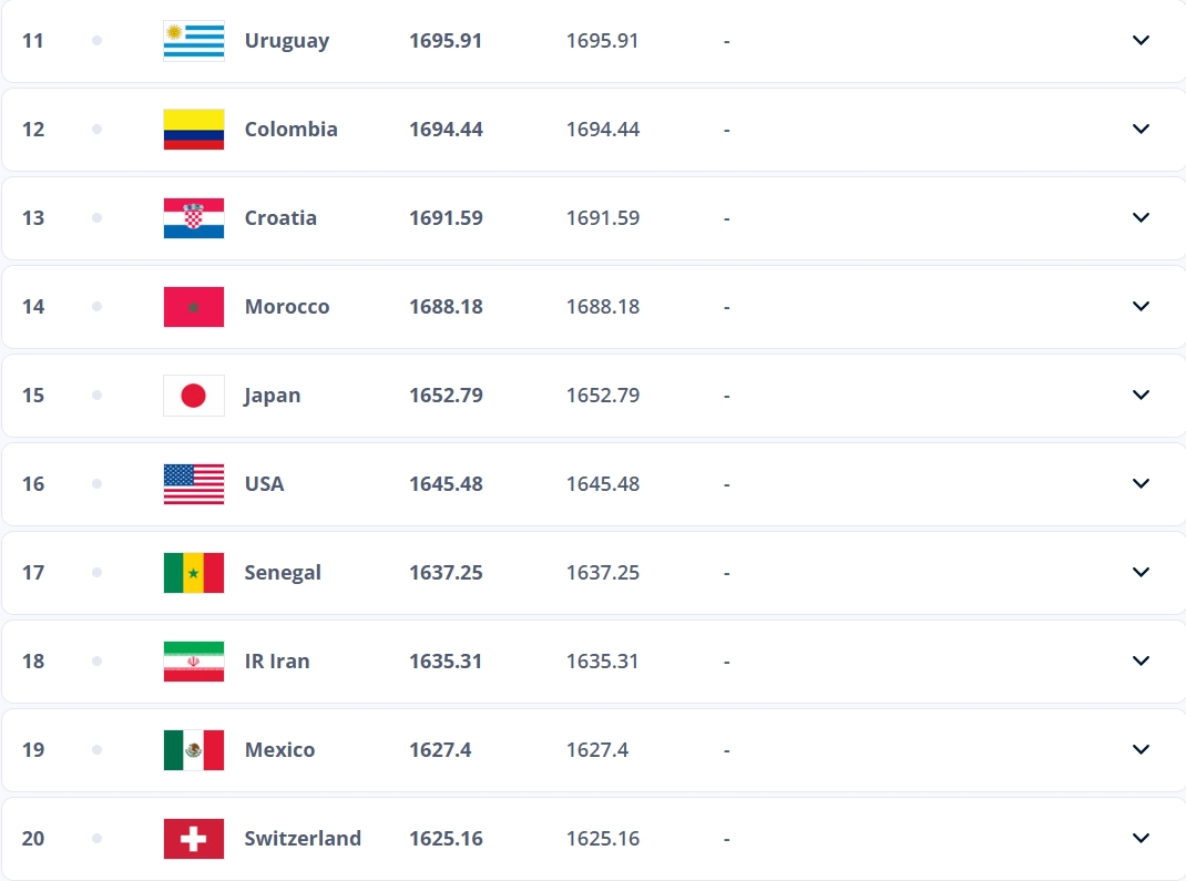 12月19日讯 国际足联公布了2024年年终国家队FIFA排名,阿根廷仍居榜首,法国、西班牙第二第三,葡萄牙排名第6,日本第15。