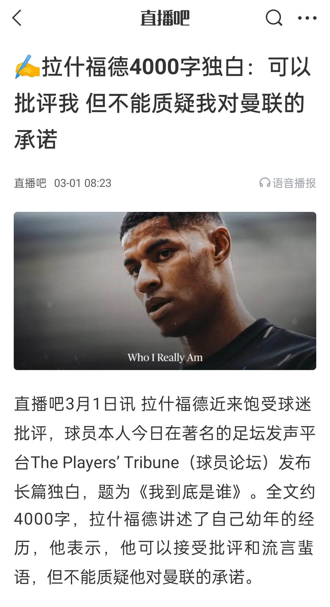 今年3月,拉什福德在曼联也遭遇过类似的情况,当时他也因表现不佳遭到批评。而他在The Players'Tribune发布了长篇文章,他在文章中表示,他可以接受批评和流言蜚语,但不能质疑他对曼联的承诺。