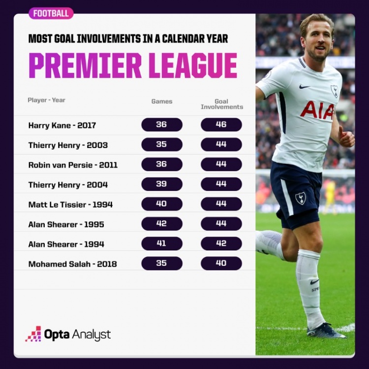 英超自然年参与进球榜:凯恩46球居首,亨利、范佩西、希勒次席