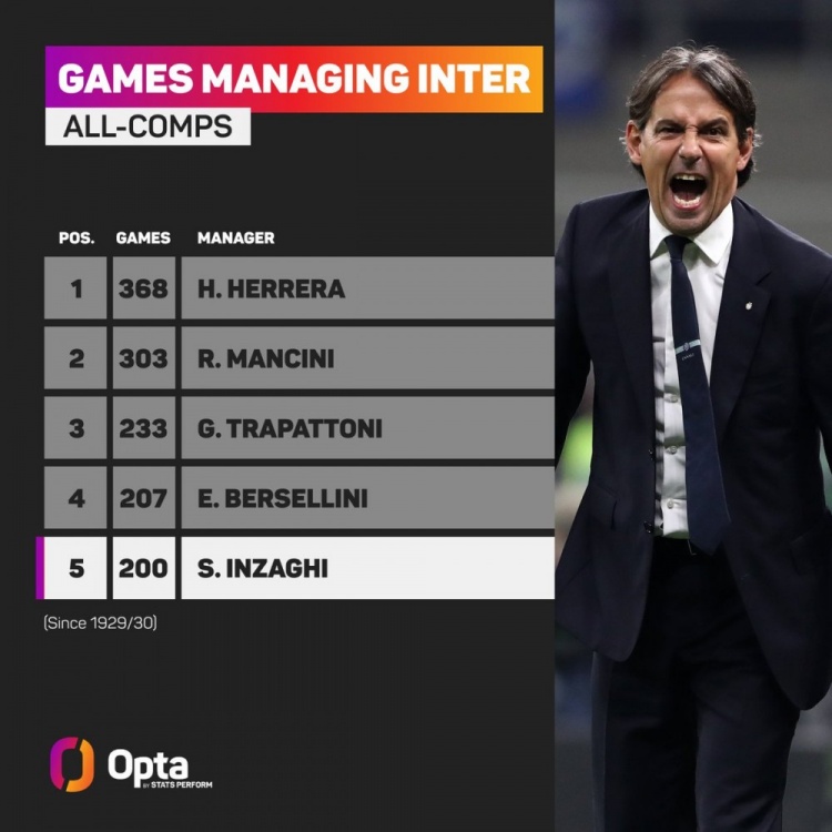 数据统计显示,他也是1929-30赛季有统计以来第5位达成此成就的国米主帅。