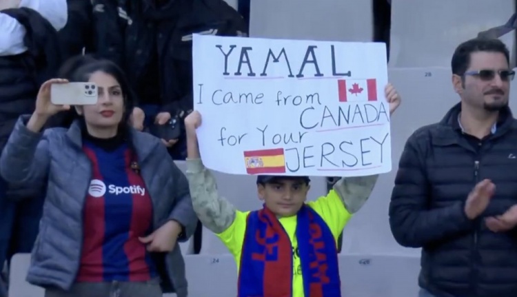 这位小球迷手举横幅,上面写着:“亚马尔,我来自加拿大,想要你的球衣!”